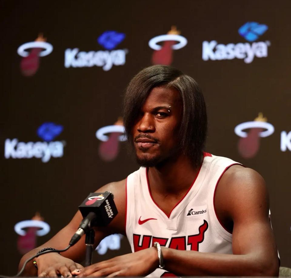 Jimmy Butler Miami Heat media kunida o`rilgan sochlar bilan. (Tasvir: Carmen Mandato/Getty Images)